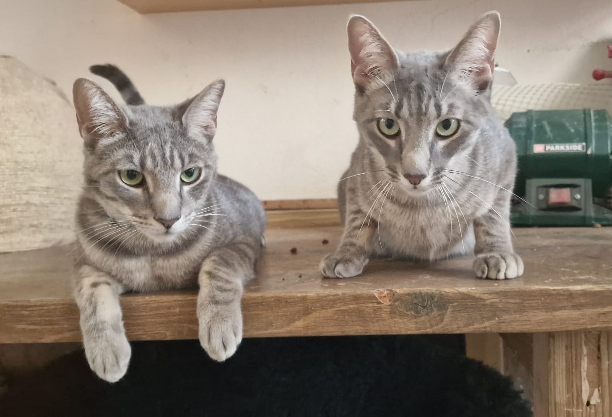Beide sind super kuschelig, sie lieben es auch auf den Arm genommen und bekuschelt zu werden. Auch lieben sie es herumzurennen und zu spielen, beide sind sehr aktiv und brauchen wirklich Platz zum Rennen. Bestechbar sind beide immer mit Nassfutter, das beide sehr lieben - sie sind wirklich total unkompliziert.